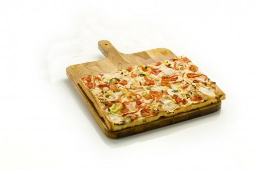 Gegrilltes Gemüse 38 % (rote und gelbe Paprika, Zucchini, Zwiebeln in unterschiedlichen Anteilen), WEIZENMEHL, Wasser, raffiniertes Sonnenblumenöl mit hohem Ölsäuregehalt, Salz, Hefe, natives Olivenöl extra, Malzextrakt (GERSTE, Mais).