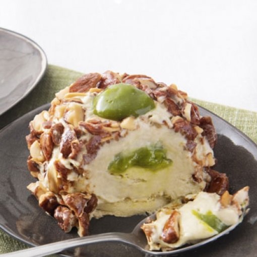 Gehackte, karamelisierte MANDELN (30,3%) (MANDELN, Zucker), Wasser, Glukose-Fruktose-Sirup, rehydrierte MAGERMILCH, Zucker, Pflanzenfett (Kokosnuss, Palme), Stabilisator: Glycerin und Sorbit, PISTAZIEN (3%), WEIZENMEHL, modifizierte Stärke, rehydriertes HÜHNEREIEIWEISS, EIER, Glukosesirup, Maltodextrin, EIGELB, Emulgatoren: Mono- und Diglyceride von Speisefettsäuren, Mono- und Diacetylweinsäureester von Mono- und Diglyceriden von Speisefettsäuren, Lecithin (aus Sonnenblumen) und Triethylcitrat, natürliche Aromen, LAKTOSE, MILCHEIWEISS, Verdickungsmittel: Pektine, Natriumalginat und Xanthan, Backtriebmittel: Diphosphate und Natriumcarbonate, Salz, Farbstoff: FD&C No.1 (Brilliant blau FCF).