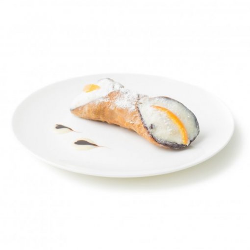 RICOTTA 48% (pasteurisierte MOLKE und SchafsMILCH, Salz), kakaoglasierte Waffel [WEIZENMEHL Typ 00, Zucker, pflanzliches Palmöl, Kakao, Salz, Aromen, Kakaoüberzug (Zucker, Pflanzenfett: Palmkern, Palm, Karite; Kakao, Emulgatoren: E476, SOJAlecithin; Aromen)], Zucker, Schokoladendrops (Zucker, Kakaomasse, Kakaobutter, Emulgator: E322 SOJAlecithin; Aroma), Garnierung: kandierte Orangenschale (Orangenschale 53,7 %, Glukose-/Fruktosesirup, Saccharose, Säureregulator: E330; Konservierungsmittel: E220 SCHWEFELDIOXID), Zuckerzubereitung (Zucker, WEIZENstärke, Pflanzenfett: Palme.
